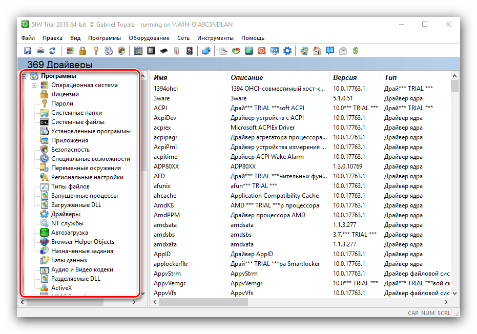 В меню слева можно также узнать программные особенности машины – например, сведения об операционной системе и состоянии её критически важных файлов, установленные драйвера, кодеки, и прочее.