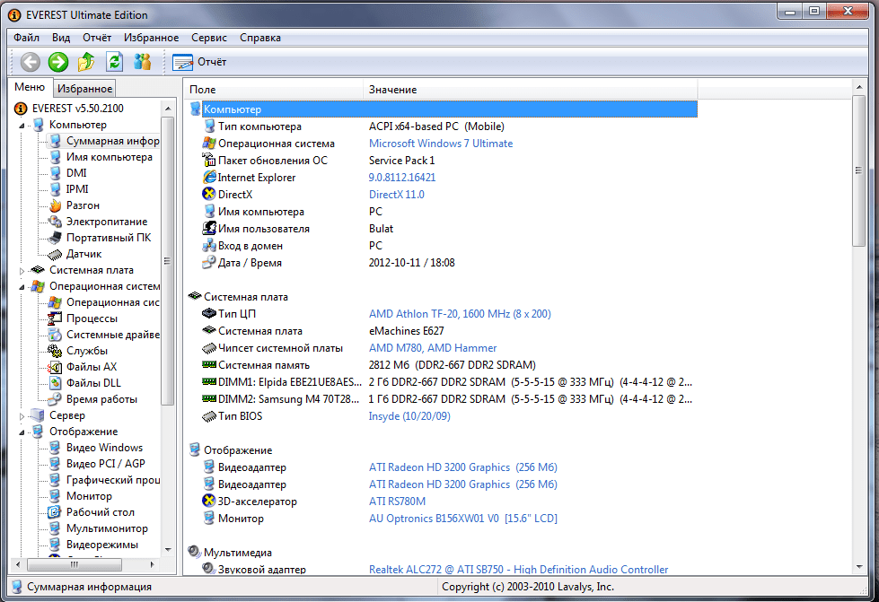 В данном разделе Вы сможете получить полные сведения о процессоре, звуковой карте, жестком диске, аккумуляторе и многом другом. Просто щелкните по интересующей Вас вкладке и просмотрите свойства устройства.