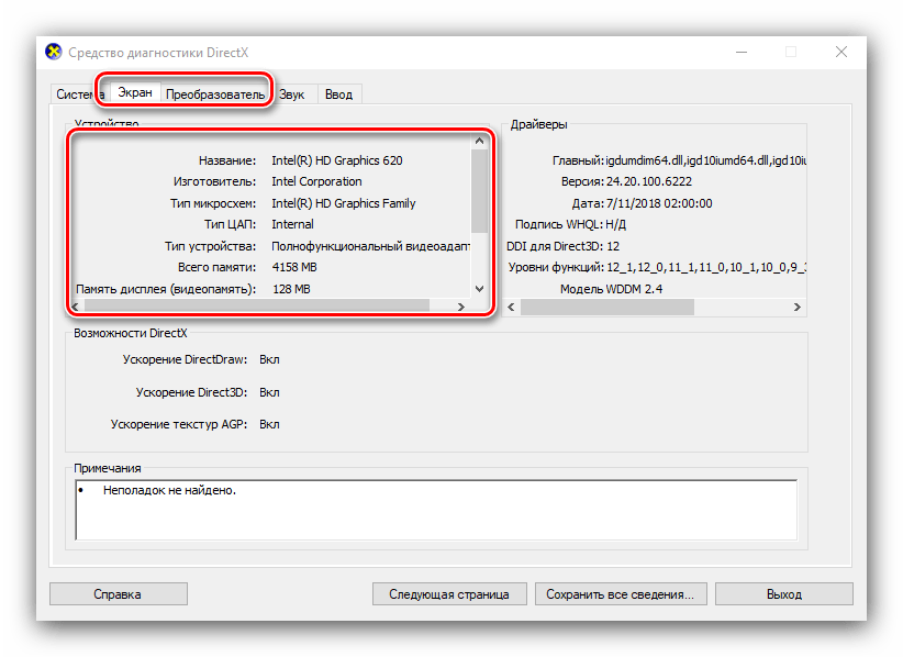Вкладка «Экран» содержит данные о видеоускорителе девайса: тип и объём памяти, режим и многое другое. Для ноутбуков с двумя GPU отображается также вкладка «Преобразователь», где размещена информация о незадействованной в данный момент видеокарте.