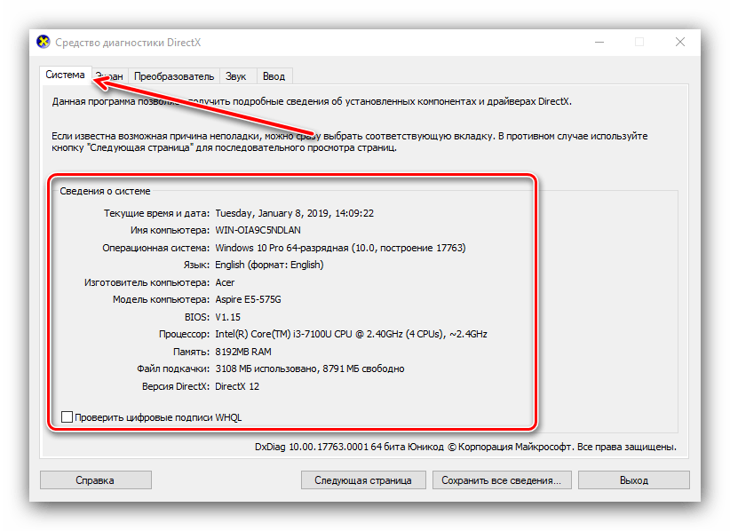 Откроется окно диагностической утилиты. На первой вкладке, «Система», можно просмотреть расширенную информацию об аппаратных возможностях компьютера – кроме сведений о CPU и RAM, доступны данные об установленной видеокарте и поддерживаемой версии DirectX.
