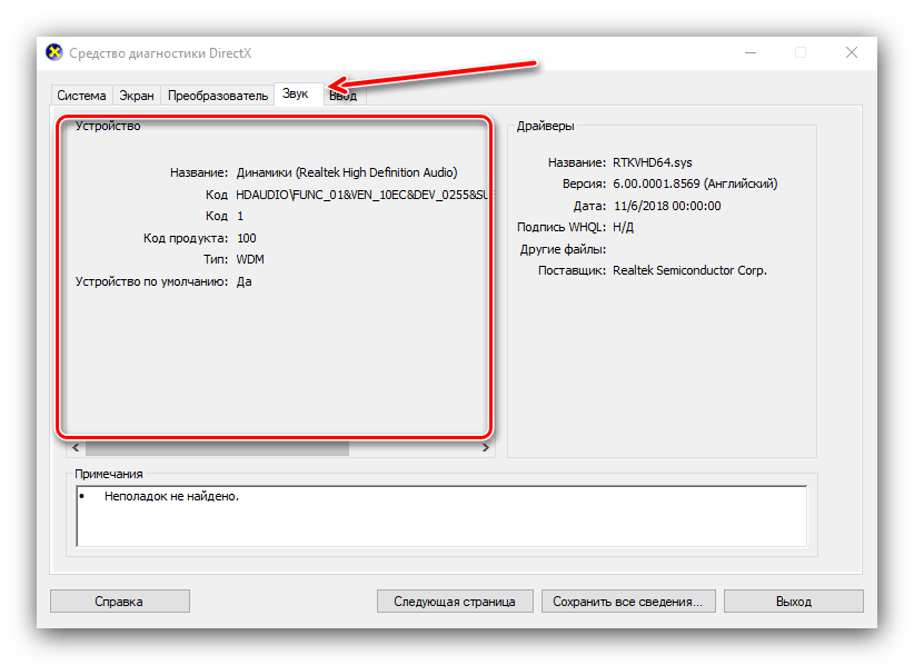 В разделе «Звук» можно просмотреть сведения о звуковых устройствах (карте и динамиках).