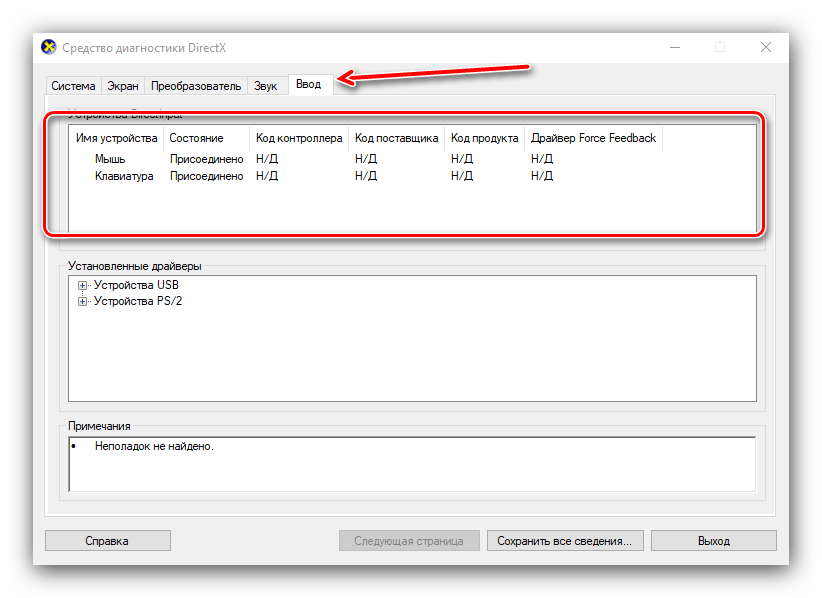 Название вкладки «Ввод» говорит само за себя – здесь располагаются данные о клавиатуре и мыши, подключённых к компьютеру.