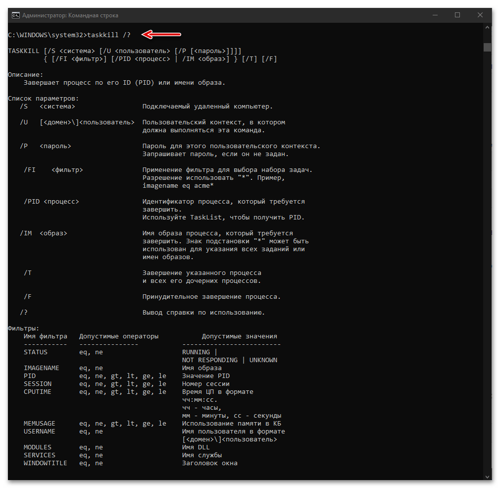 Использованная нами в рамках данного метода команда taskkill поддерживает ряд опций, которые можно использовать для завершения задач через «Командную строку». Чтобы узнать их, введите и выполните следующую команду: