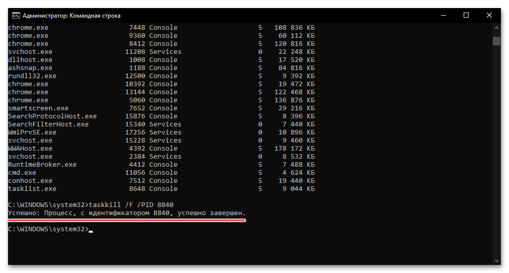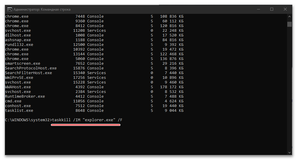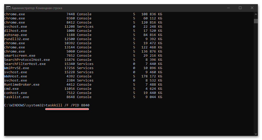 - после ввести taskkill /IM chrome.exe /f и нажать Enter (вместо “chrome.exe” – указывается имя нужного процесса).