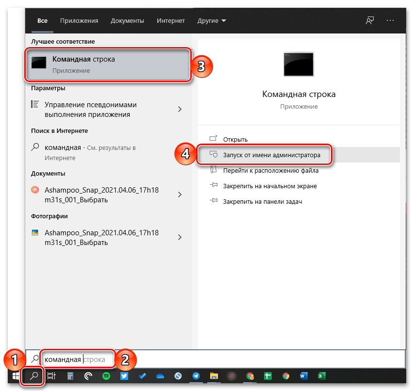 - Запустите «Командную строку» от имени администратора. Это можно сделать через меню, вызываемое нажатием ПКМ на кнопке «Пуск» или введя название программного компонента в поиск и выбрав в результатах выдачи соответствующий пункт.