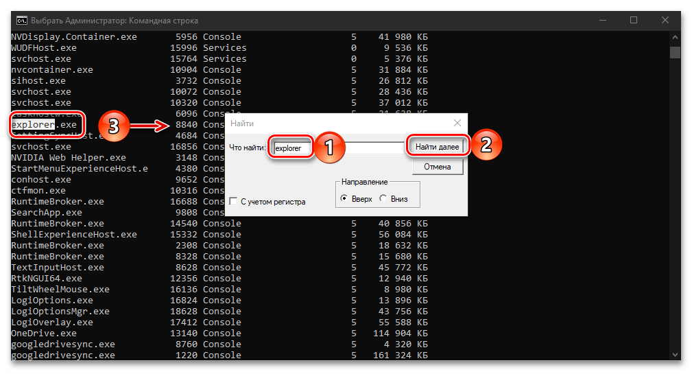 Мышью или комбинацией «Ctrl+стрелка вниз» прокрутите список задач в окне командной строки, ища повисшую программу (имя файла, скорее всего, будет схожим с названием программы – например, если это Adobe Photoshop, файл будет называться Photoshop.exe).