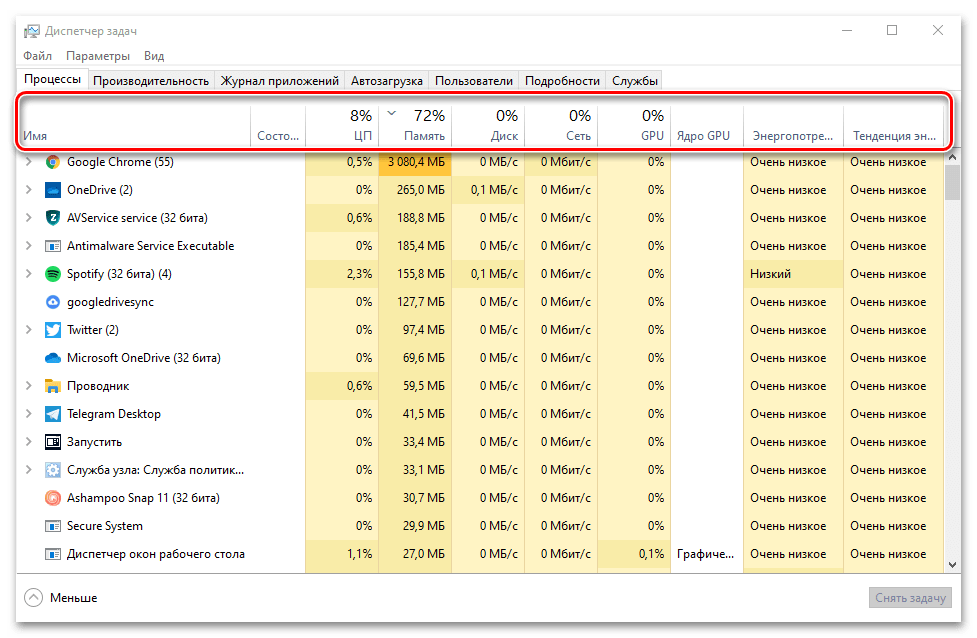 Вкладка Процессы показывает, как открытые приложения, так и фоновые процессы.