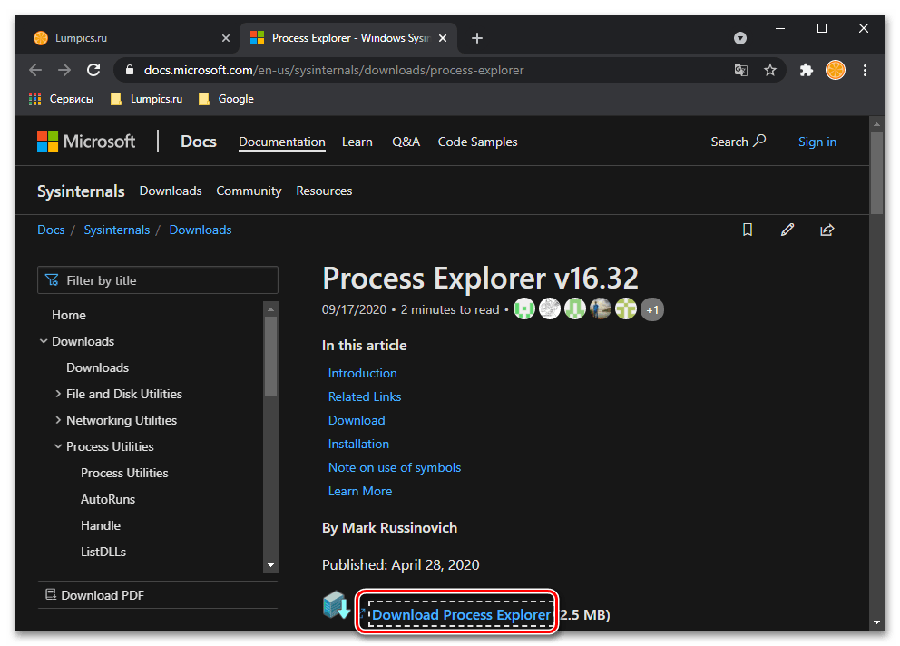 - Воспользуйтесь представленной выше ссылкой для перехода на страницу загрузки ПО и кликните по надписи «Download Process Explorer».