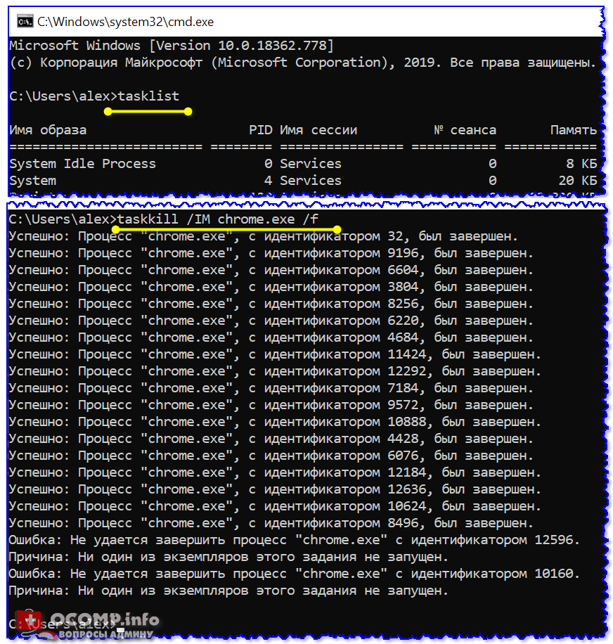 Командная строка — универсальная штука, которая может помочь и с закрытием (ликвидацией) зависших процессов (программ). Кстати, если вы наловчитесь с ее использованием — закрывать зависшие полно-экранные приложения можно будет даже в “слепую” (когда на экране ничего не отображается).