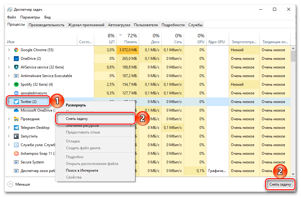 Далее кликните правой кнопкой зависшую программу и выберите «Снять задачу».