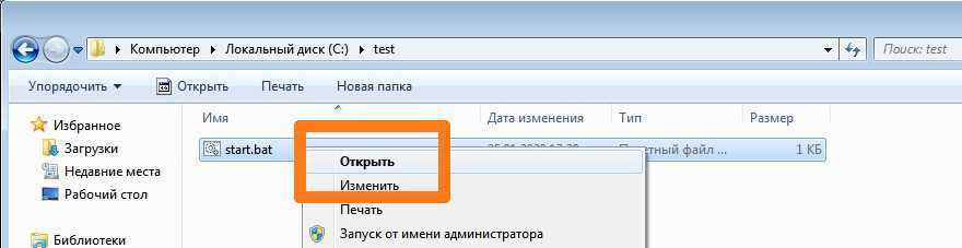 - Чтобы отредактировать уже созданный файл bat, щелкнуть на нем мышью (правой), использовав пункт «Изменить». При помощи клика ПКМ выбираем пункт «Изменить»