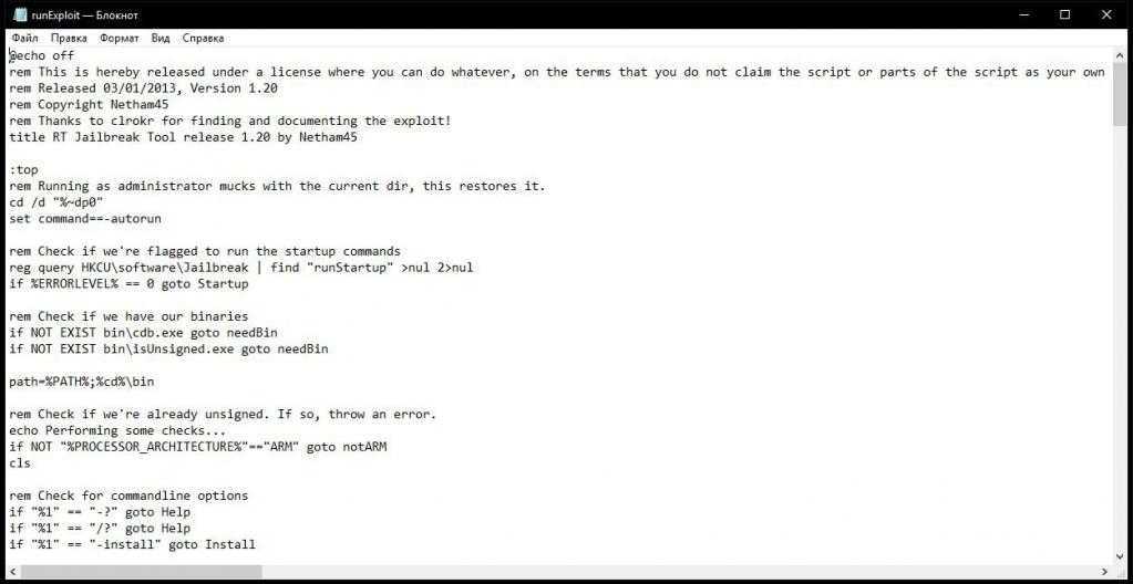 Выход был найден и представлен группой энтузиастов в виде небольшой утилиты RT_Jailbreak 1.20, которая содержит «батник», позволяющий отключить проверку цифровых подписей устанавливаемых приложений (без подписи Microsoft инсталляция оказывается невозможной, равно как и отключение проверок средствами самой системы, в которой такие средства заблокированы).