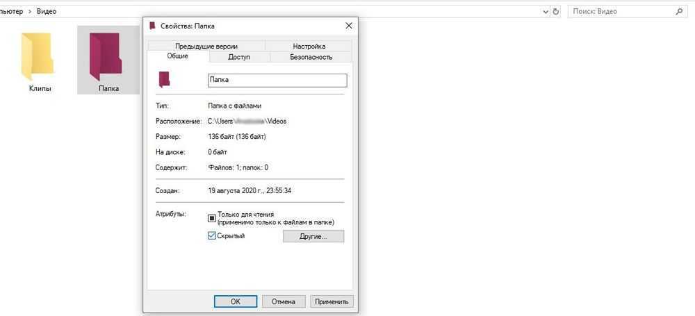 Обратите внимание на «Атрибуты». Если установить галочку напротив параметра «Скрытый», а затем сохранить изменения, то папка станет скрытой. Для того, чтобы завершить действия, настройте отображение данных объектов в операционной системе