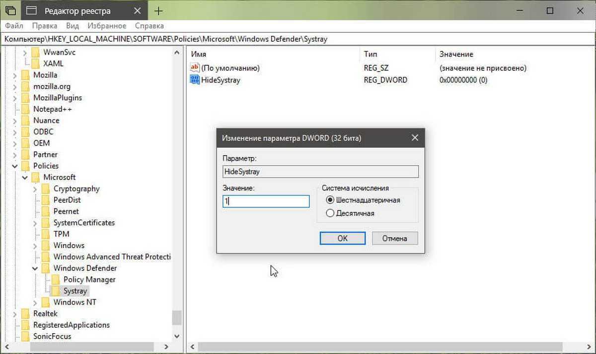 - Установите для данного параметра значение 0, чтобы защитник Windows был включен или 1, если его требуется отключить.