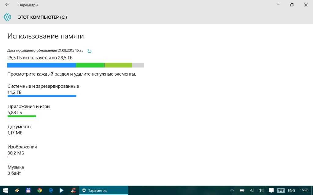 В разделе «Память устройства», в опции «Локальный диск (С:)» имеется информация о распределении дискового пространства.
