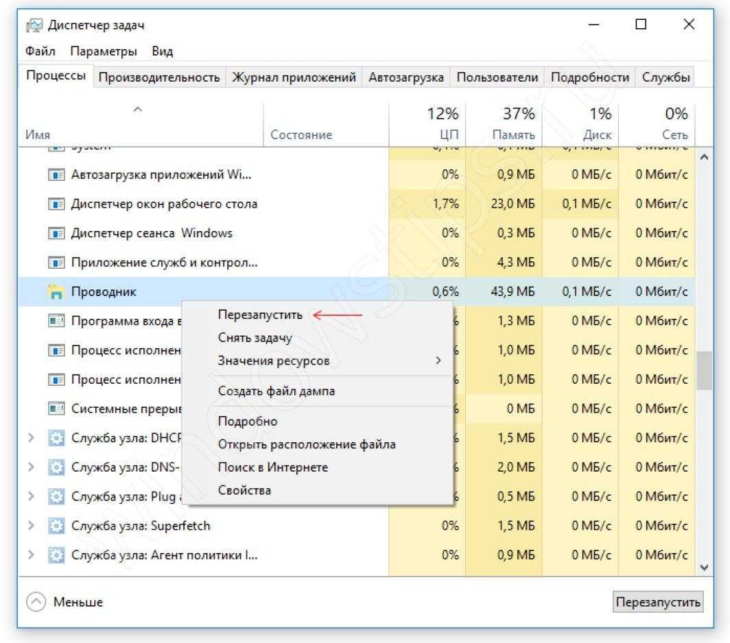 Первый совет банален — для начала перезагрузите компьютер. Кроме этого, не лишним было бы в процессе настроек значков — нажать Ctrl+Alt+Del, открыть диспетчер задач и перезапустить проводник.