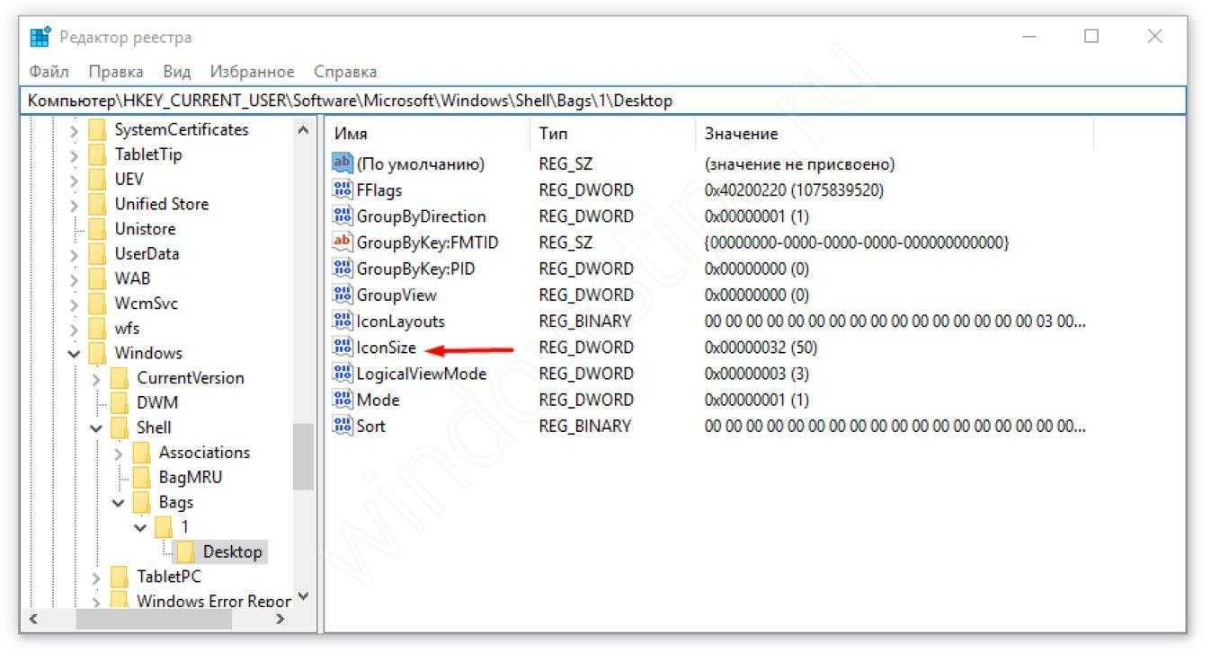 За изменения размера иконок отвечает параметр IconSize. В десятичной системе 32 – мелкие значки, 48 – обычные и 96 – крупные.