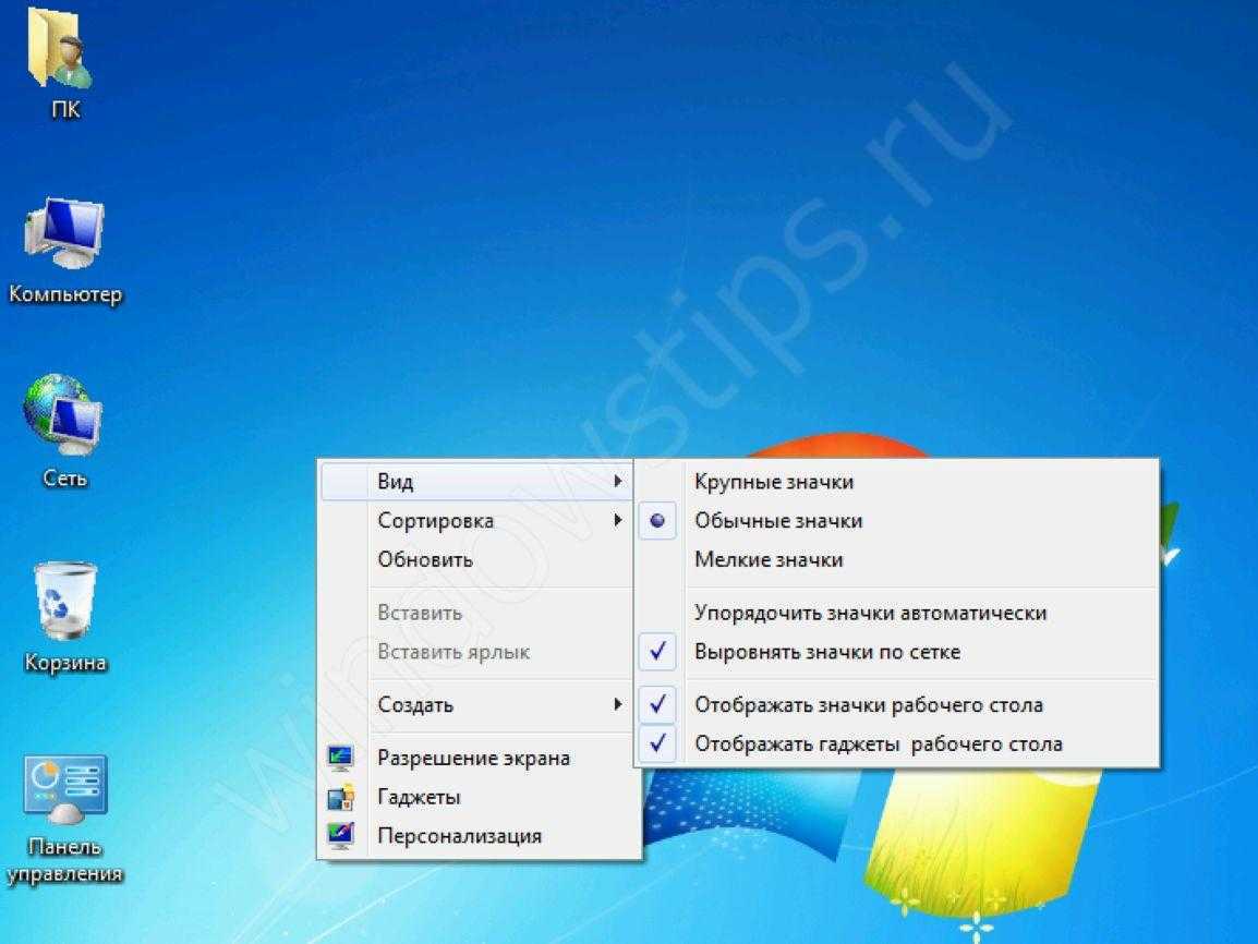 Контекстное меню рабочего стола содержит много настроек, от создания папки или файла, быстрого запуска стандартных приложений или настроек, до изменения размеров значков рабочего стола Windows 7.