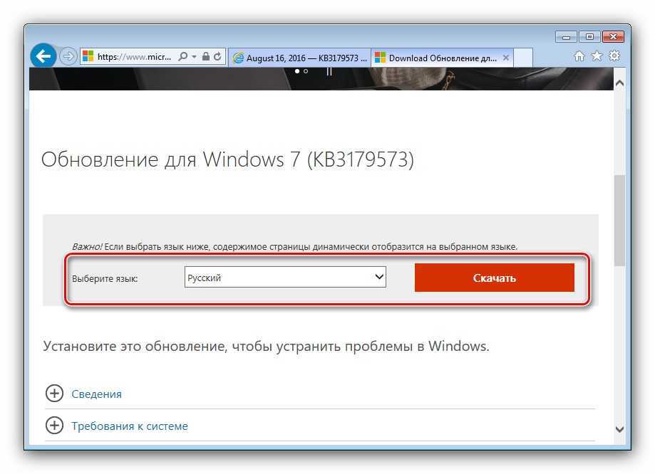 - Прокрутите страницу до блока «Method 3: Microsoft Download Center», затем найдите в таблице ссылку, которая соответствует разрядности вашей версии Виндовс 7, и нажмите на неё для начала загрузки. Далее выберите язык «Русский» и нажмите «Скачать».