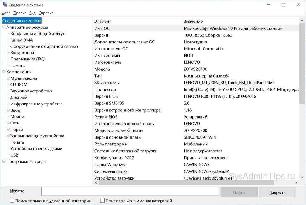 илиСведения о системе вызывается командой msinfo32 на Windows любой версии в окне «Выполнить » (сочетание Win + R), поисковой строке или из раздела Пуска «Средства администрирования ».