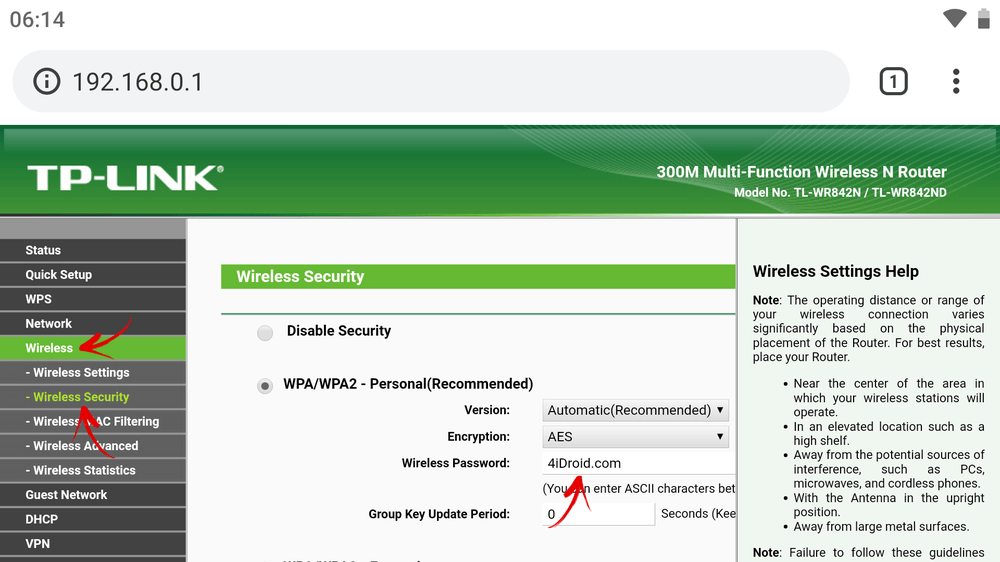- Открываем Wireless Settings, заходим в WirelessSecurity;