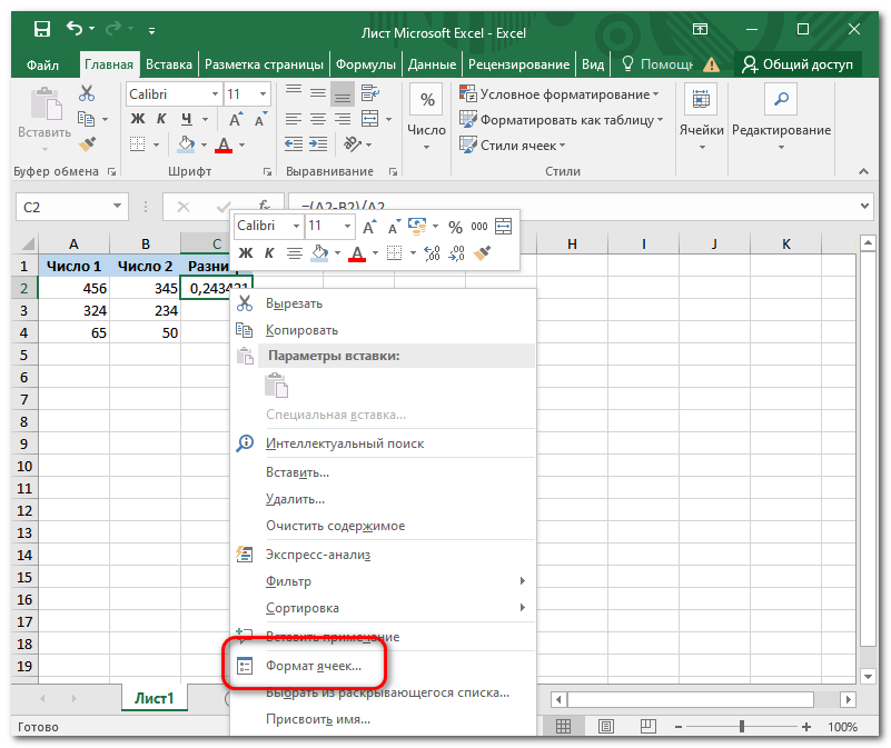 - Выделите ячейку с полученным числом и задайте ей формат как «Процентный» через вкладку «Главная» в разделе «Число».