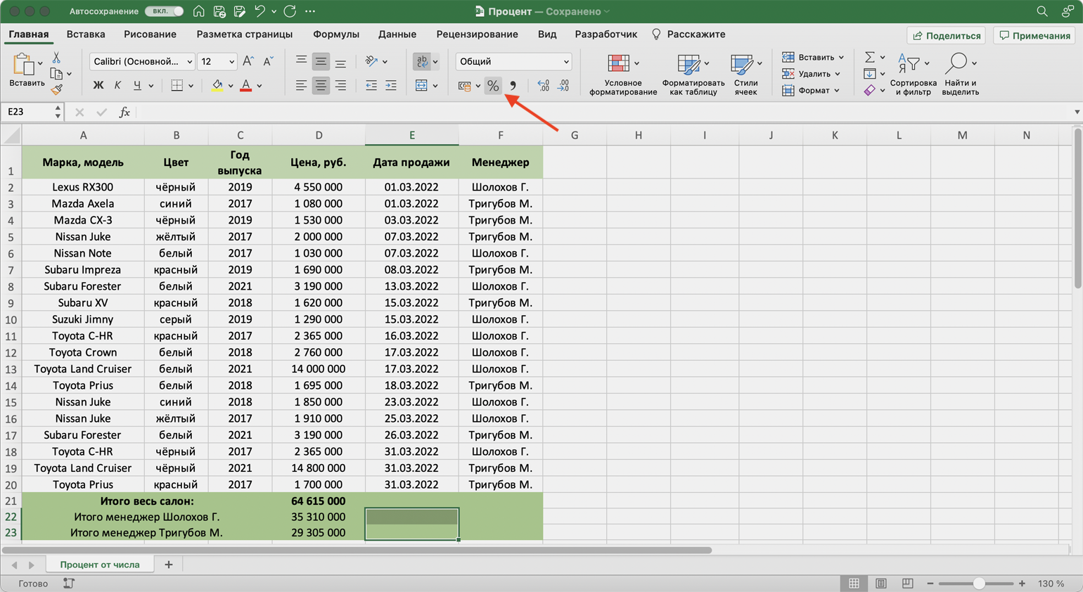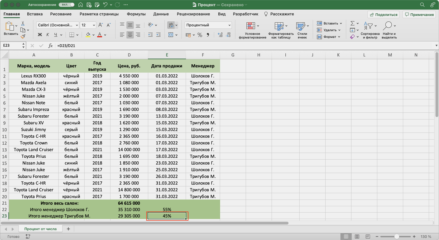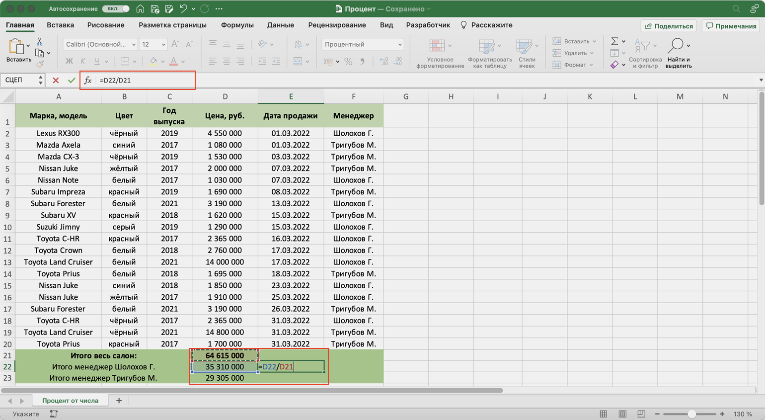 где D22 — сумма продаж первого менеджера за март, D21 — общая сумма продаж всего автосалона за март.