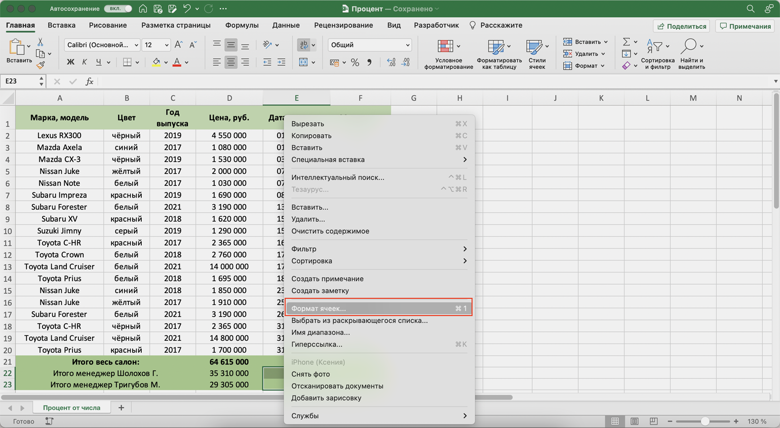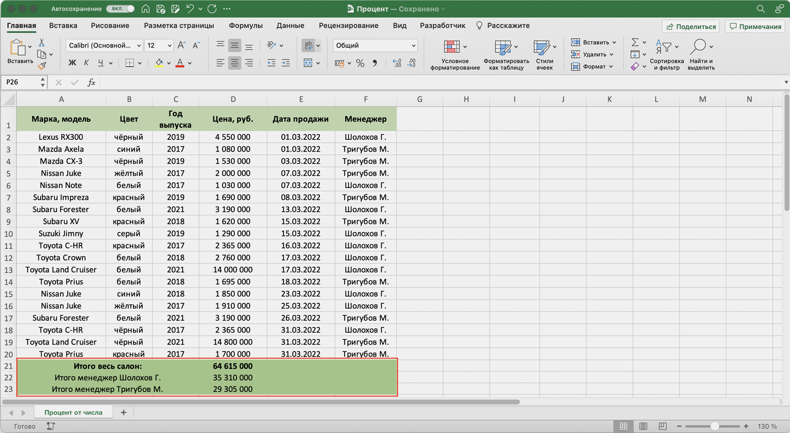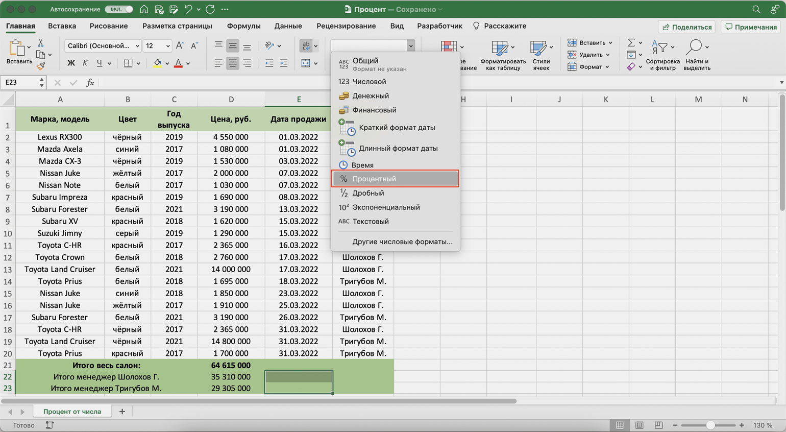 где D22 — сумма продаж первого менеджера за март, D21 — общая сумма продаж всего автосалона за март.