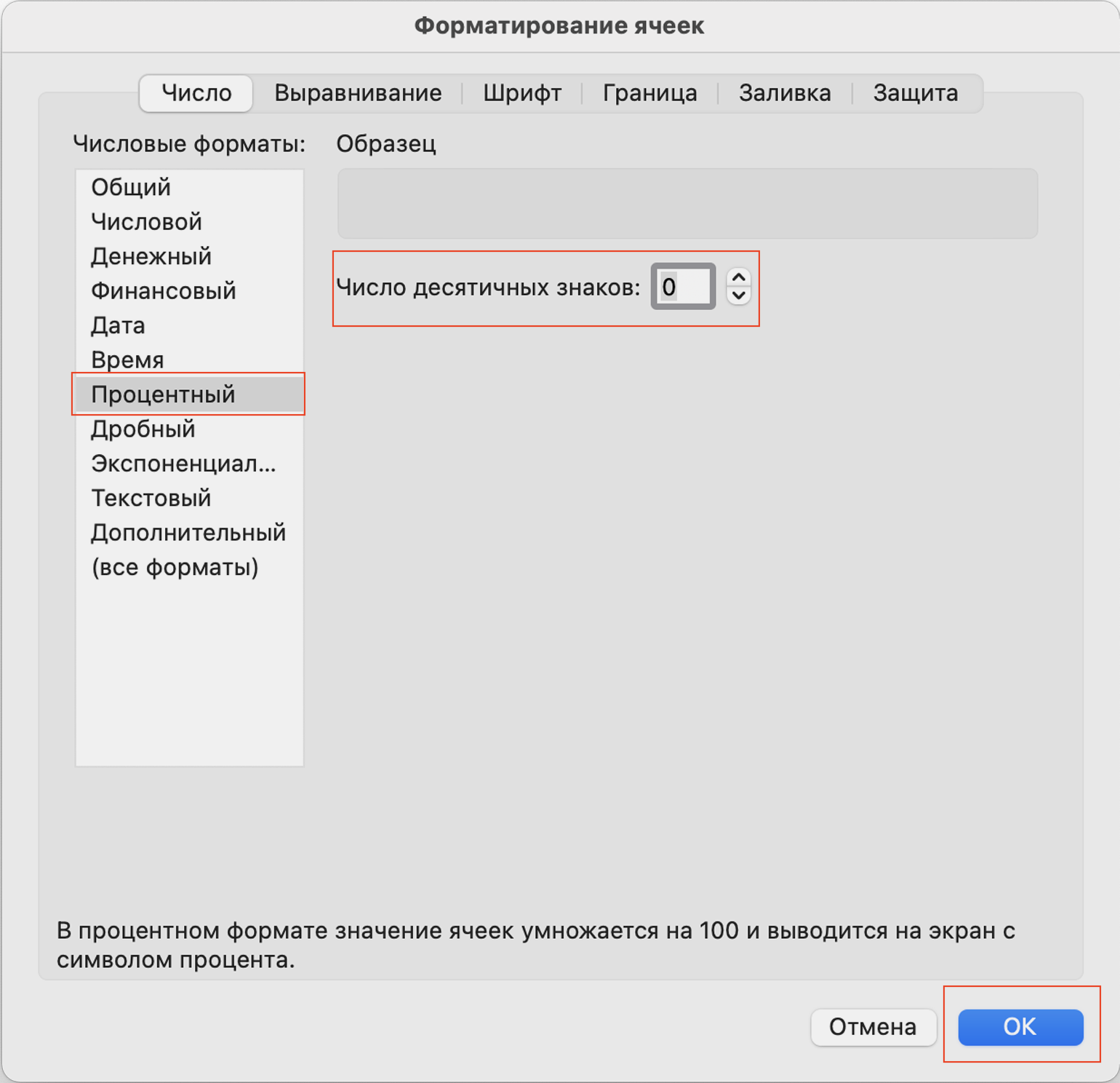 В появившемся окне нужно выбрать процентный формат и определить число знаков после запятой в поле «Число десятичных знаков». Если нужно округлить до целых — поставить 0, если нужны десятичные — 1, сотые — 2 и так далее. После этого нажать «ОК».