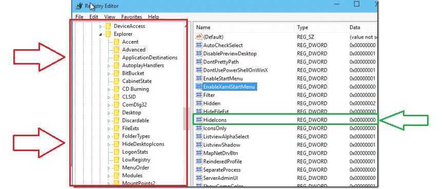 Для входа в реестр можно использовать строку «Выполнить», для ее открытия требуется нажать Вин и R. Чтобы открылся регистр нужно написать в поле «regedit». Теперь нужно пройти по такому адресу HKEY_CURRENT_USER\Software\Microsoft\Windows\CurrentVersion\Explorer\Advanced Затем в параметрах следует отыскать «HideIcons» и поменять в разделе значений цифру, с нуля на тридцать два.