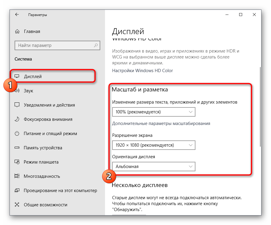 Восстановление экрана при отключении второго дисплея явно укажет на него как на причину неполадки. Чтобы ее избежать, при следующем подключении устройства нужно будет открыть уже известную вам настройку «Разрешение экрана», затем открыть пункт «Несколько дисплеев» и выставить нужное разрешение для каждого устройства вручную.