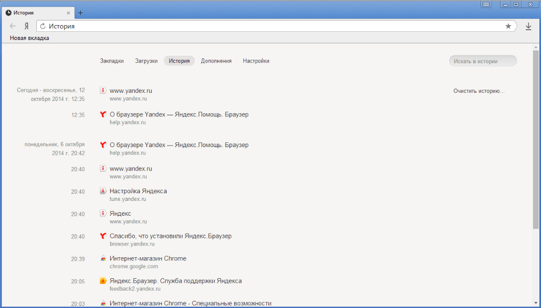 Дальше все делается по аналогии с другими браузерами. Здесь также имеется окошечко поиска по истории.