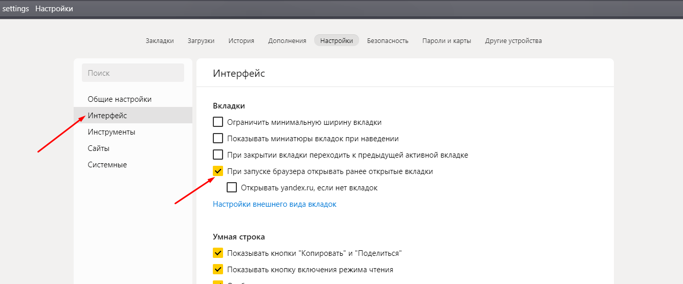 Затем нажимаем на «Интерфейс» и ставим напротив пункта «При запуске браузера открывать ранее открытые вкладки» галочку.