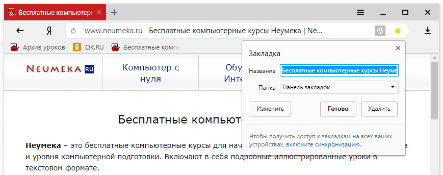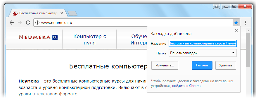 Появится окошко, в котором написано, что закладка добавлена. Это значит, браузер запомнил данный сайт.