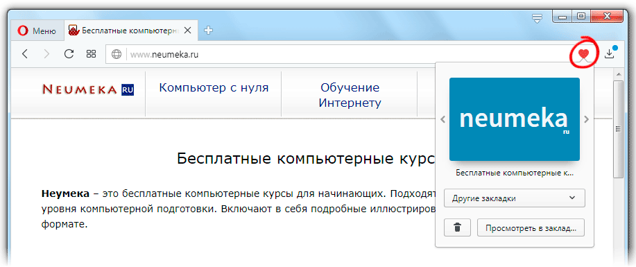 Opera . Принцип закрепления вкладок в Опере почти такой же, как и в Google Chrome. Нажимаем на картинку с сердечком в конце адресной строки и получаем окошко закрепления.