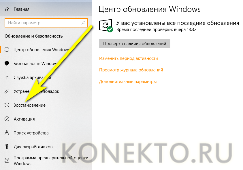 Переключиться на вкладку «Восстановление».