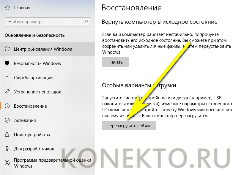 - В левой части окна нажмите на пункт «Восстановление». И кликните по кнопке «Перезагрузка». После этого устройство выключится и включится заново. Но стандартный старт операционной системы не произойдет. Вы увидите специальное меню, которое содержит в себе множество инструментов, направленных на устранение неполадок.