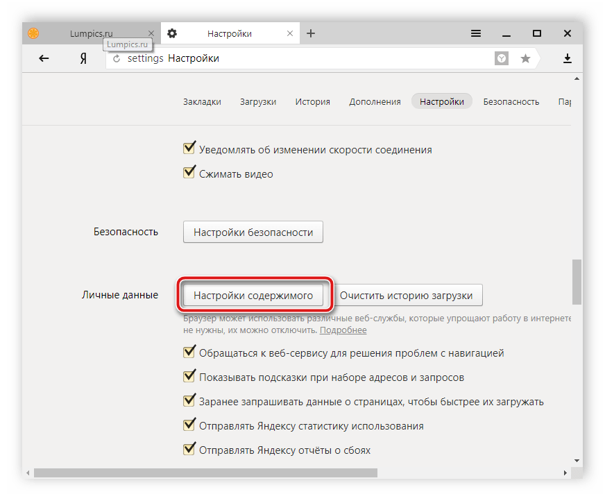 В разделе «Личные данные» выберите «Настройки содержимого».
