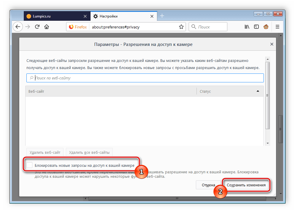 Поставьте галочку возле «Блокировать новые запросы на доступ к вашей камере». Перед выходом не забудьте применить настройки кликом на кнопку «Сохранить изменения».