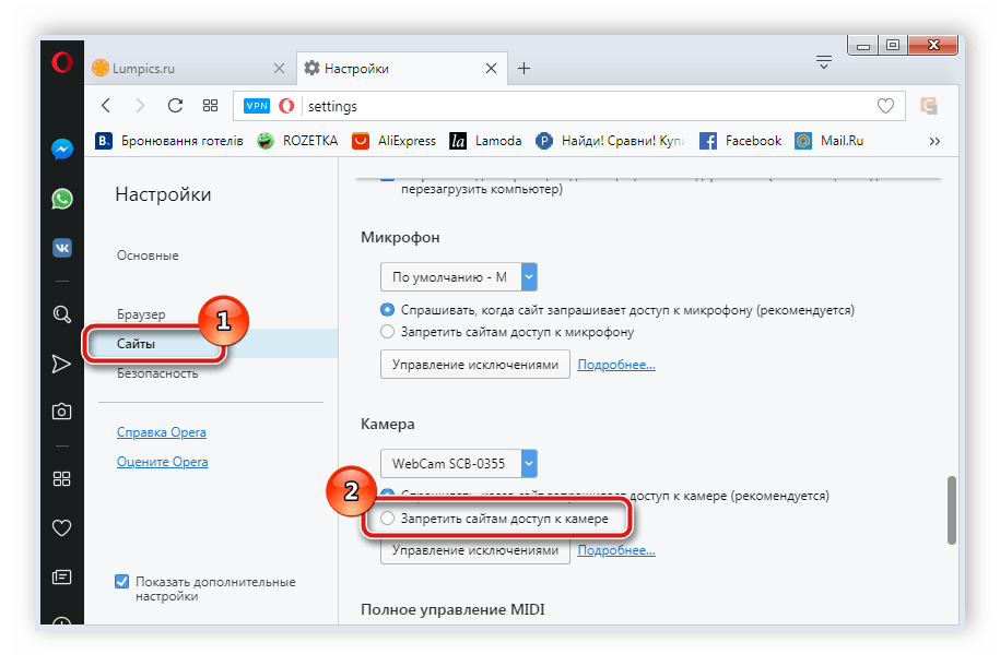 Слева находится навигация. Перейдите к разделу «Сайты» и найдите пункт с настройками камеры. Поставьте точку возле «Запретить сайтам доступ к камере».