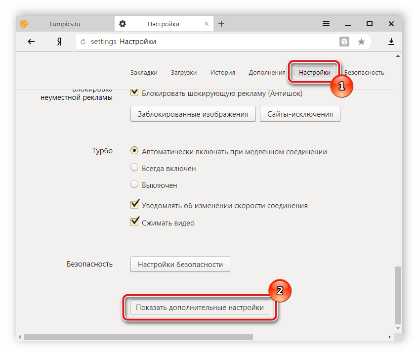 Сверху находятся вкладки с категориями параметров. Перейдите в «Настройки» и нажмите «Показать дополнительные настройки».