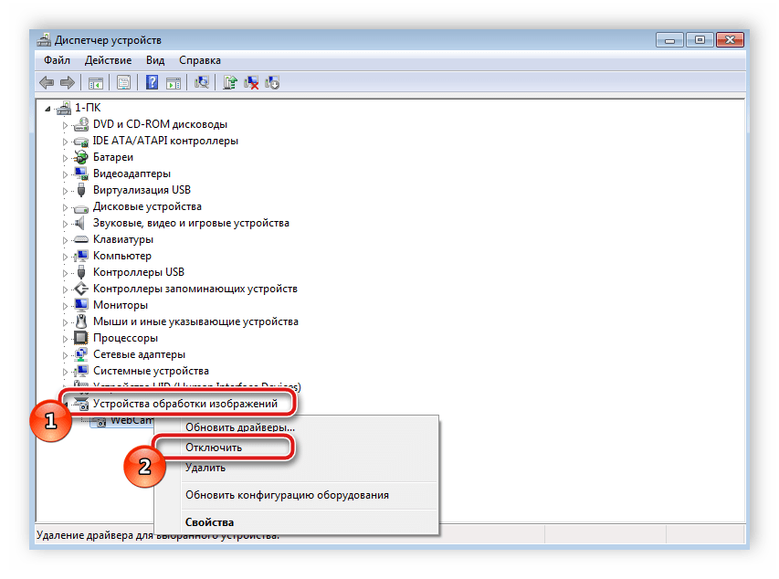 Обратите внимание на то, что лучше всего не удалять камеру в диспетчере устройств, прислушиваясь к советам многих источников. Достаточно будет просто отключить устройство, после чего оно перестанет работать