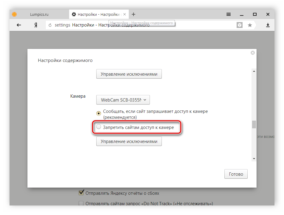 Если вы являетесь пользователем любого другого менее популярного браузера, то так же можете отключить в нем камеру. Вам достаточно только ознакомиться с инструкциями выше и найти идентичные параметры в своем веб-обозревателе. Все они разрабатываются примерно по одному алгоритму, поэтому выполнение данного процесса будет схоже с описанными выше действиями.
