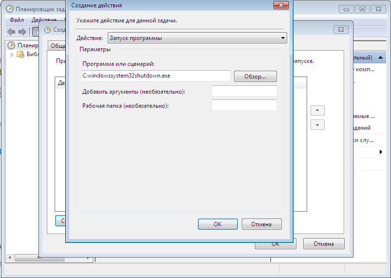 Шаг 3. Перейдите в раздел «Действия». Создайте действие, введя в строку сценария «C:windowssystem32shutdown.exe». Нажмите на кнопку «ОК».