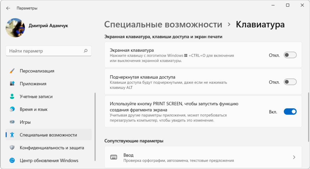 В подразделе Параметры > Специальные возможности > Клавиатура можно упростить его запуск. Использование PrintScreen, чтобы запустить функцию создания фрагментов экрана. Учитывайте другие параметры приложения, может потребоваться перезагрузить компьютер.