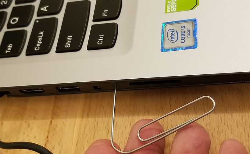 У современных моделей кнопка «Novo Button» спрятана в небольшом отверстии. Обычно оно располагается на боковой части и помечается таким же значком — стрелкой, похожей на перевернутую букву U. Например, на ноутбуке Lenovo Ideapad 320-15ISK отверстие находится слева рядом с портами USB. Чтобы зайти в BIOS, потребуется использовать скрепку или иголку. Сокрытие кнопки позволяет избежать случайного нажатия.