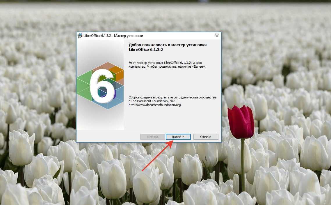 3. Через некоторое время открывается диалоговое окно с предложением установить пакет LibreOffice на ваш компьютер. Соглашаемся нажатием кнопки «Далее».
