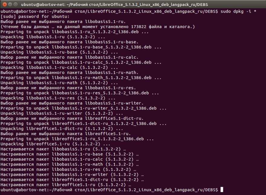 Установить можно и отдельные компоненты — не всем нужен целый пакет, кто-то ограничивается одним текстовым редактором. Для этого в команде нужно добавить к libreoffice через дефис название компонента: