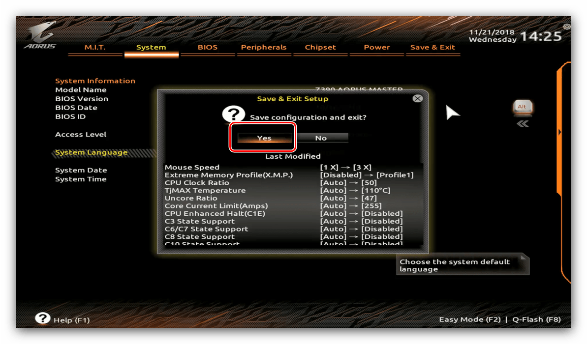 - После внесения изменений сохраните настройки. Происходит это точно таким же образом, как и в предыдущем варианте: нажмите F10 и подтвердите желание сохранить параметры.