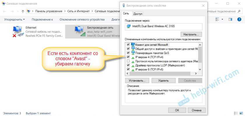 Проверяем, нет ли компонентов от антивируса Avast в свойствах подключения (Беспроводная сеть, или Ethernet)